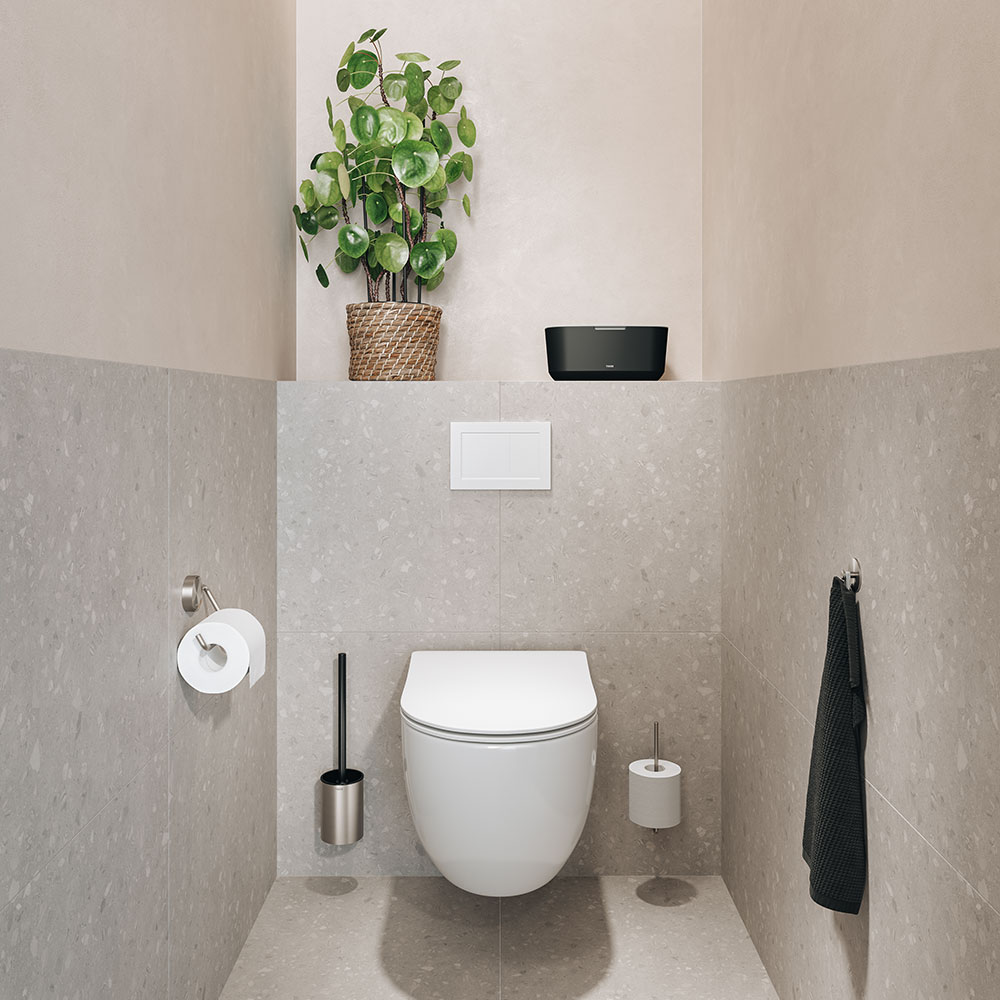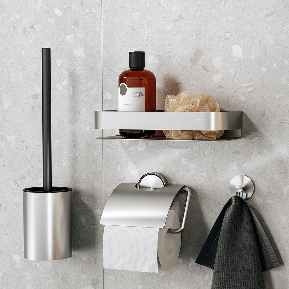 Μοντέρνα απλότητα με μινιμαλιστικό σχεδιασμό. Καλωσορίστε τη βούρτσα και τη θήκη τουαλέτας Tiger Ace! Το βουρτσισμένο χρώμα από ανοξείδωτο ατσάλι σε συνδυασμό με το μαύρο ABS εξασφαλίζει ευρεία εφαρμογή σε οποιοδήποτε μπάνιο. Χάρη στον μηχανισμό ολίσθησης, το κρέμασμα είναι παιδικό παιχνίδι. Και, για τους λάτρεις του μη DIY ανάμεσά μας: μπορείτε εύκολα να συνδέσετε τη ράγα με αυτοκόλλητη ταινία 3M. Η διαχρονική εμφάνιση καθιστά τα αξεσουάρ Tiger Ace κατάλληλα για κάθε στυλ μπάνιου. Το Ace είναι η λύση σας για μια κομψή τουαλέτα.
