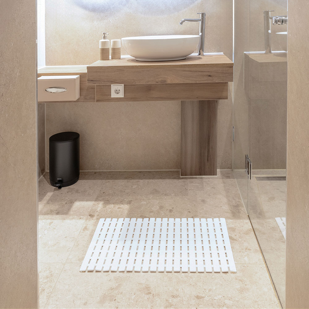 Δημιουργήστε ένα ασφαλές μπάνιο με το αντιολισθητικό πατάκι μπάνιου Nora. Ο κομψός σχεδιασμός σε λευκό χρώμα διασφαλίζει ότι το χαλάκι ασφαλείας ταιριάζει σε κάθε μπάνιο. Το χαλάκι 39x69cm προσφέρει αρκετή αντιολισθητική επιφάνεια στον νεροχύτη σας ή στο μπάνιο.