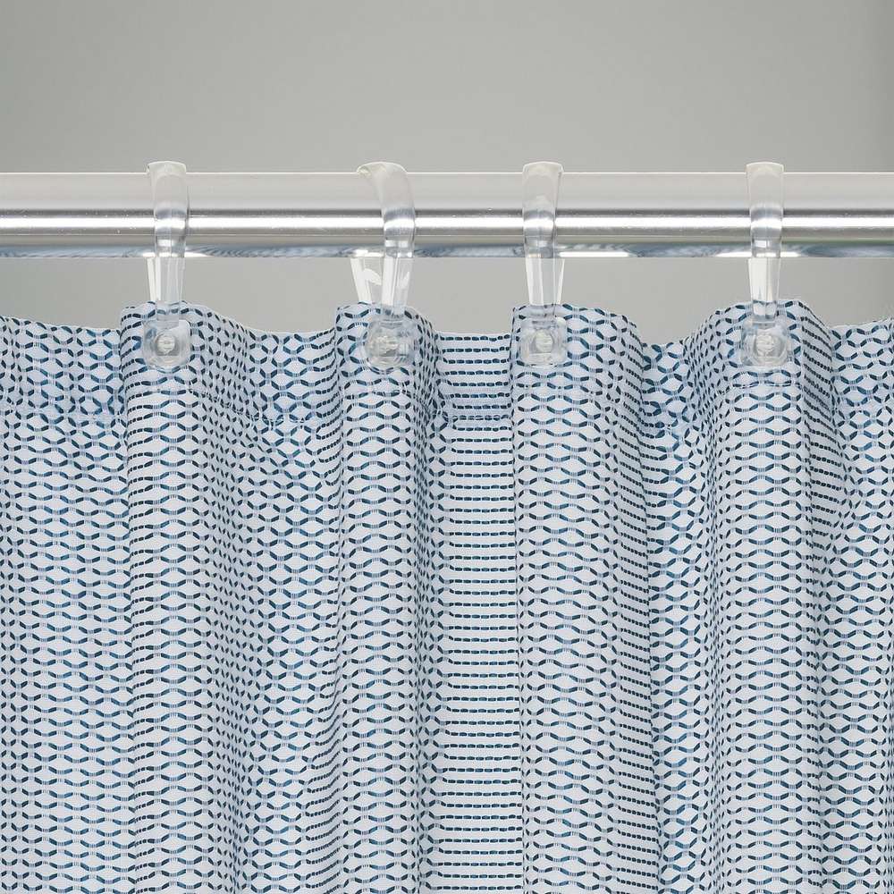 Η κουρτίνα Wave είναι μια εξαιρετικά πολυτελής κουρτίνα μπάνιου από τη Sealskin με υφαντό μοτίβο. Η βάση της κουρτίνας ντους είναι λευκή, ενώ η γεωμετρική ύφανση είναι κατασκευασμένη σε μπλε χρώμα.