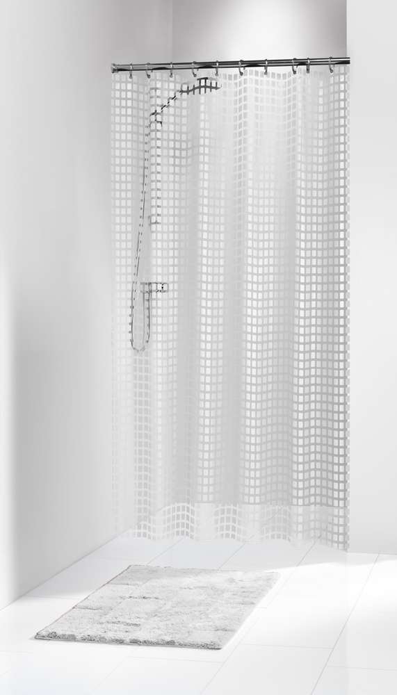Μια διαφανής κουρτίνα μπάνιου με διαχρονικό σχέδιο από τη σειρά Elemental της Sealskin. Η κουρτίνα μπάνιου αυτή φυσικά φροντίζει επίσης να παραμείνουν στεγνά όλα όσα βρίσκονται έξω από το μπάνιο.